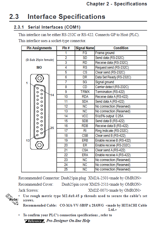 COM1:25 pin female holder, supporting RS-232C or RS-422. If RS-422 is used, the following pins must be short circuited accordingly: