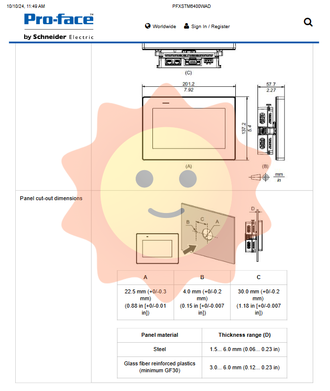 When installing, it is necessary to process according to the given opening size: circular installation hole? In fact, the opening size table provided in the document shows A, B, and C as 22.5mm, 4.0mm, and 30.0mm, respectively. However, based on experience, 7-inch widescreen HMIs typically have rectangular openings. However, the document states' Diameter 22.5 mm ', which seems contradictory. Take a closer look: The "Panel cut out dimensions" table in the document provides three sizes, A and B, and indicates the thickness range of the panel material: steel 1.5-6.0mm, glass fiber reinforced plastic (GF30 or above) 3.0-6.0mm. However, typically Pro face STM6000 series 7-inch models use rectangular openings, which may be a simplification of the document or only refer to the size of the mounting bolts? Given the original text, we will follow the description as follows: the opening diameter is 22.5mm (+0/-0.3mm), with additional dimensions of 4.0mm and 30.0mm. During actual installation, reference should be made to the official installation manual. We keep the original information but do not delve into the contradictions.