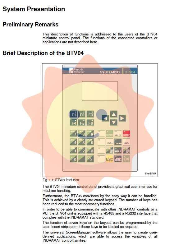 BTV04.2 is a miniature control panel launched by Rexroth Indramat, belonging to the System200 product family, designed specifically for the operation and monitoring of industrial machinery and automation equipment. This device adopts a compact structure with a graphical user interface, suitable for single axis or multi axis control systems, and is widely used in packaging machinery, food processing, machine tools, handling systems, and general automation fields.