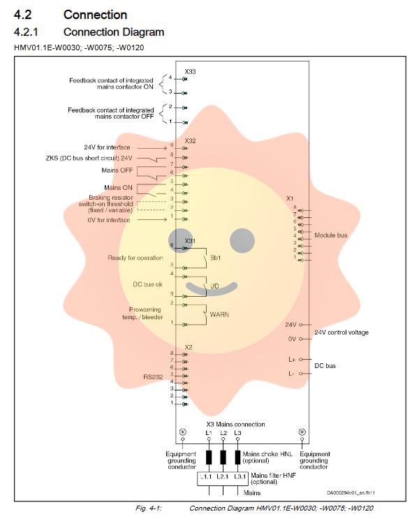Figure 4-1 shows the connections of the HMV01.1E series (W0030/W0075/W0120), including main power inputs (L1, L2, L3, PE), DC bus outputs (L+, L -), 24V control power supply (X9), and internal relay contacts (X14).