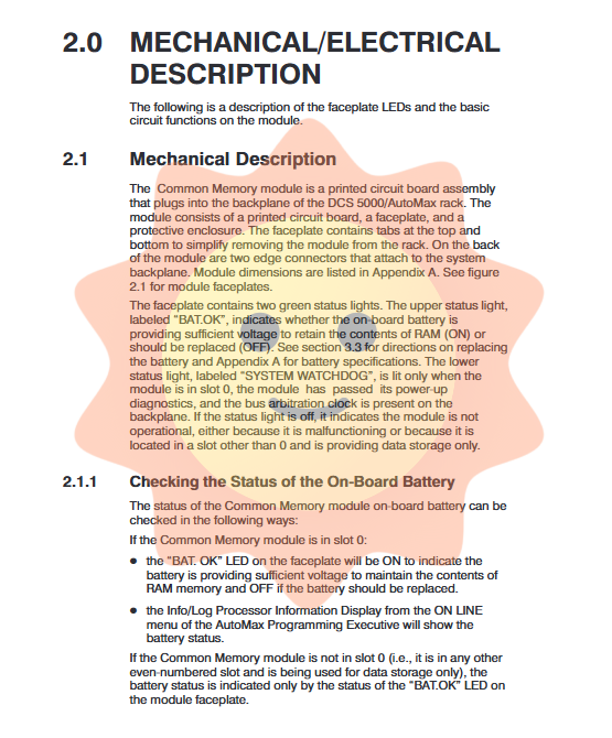 The Common Memory Module is a specialized module designed specifically for DCS 5000/AutoMax racks. Its main design goal is to support the collaborative work of multiple processor modules within a physical rack. This module plays two crucial roles, depending on which slot it is installed in the rack: