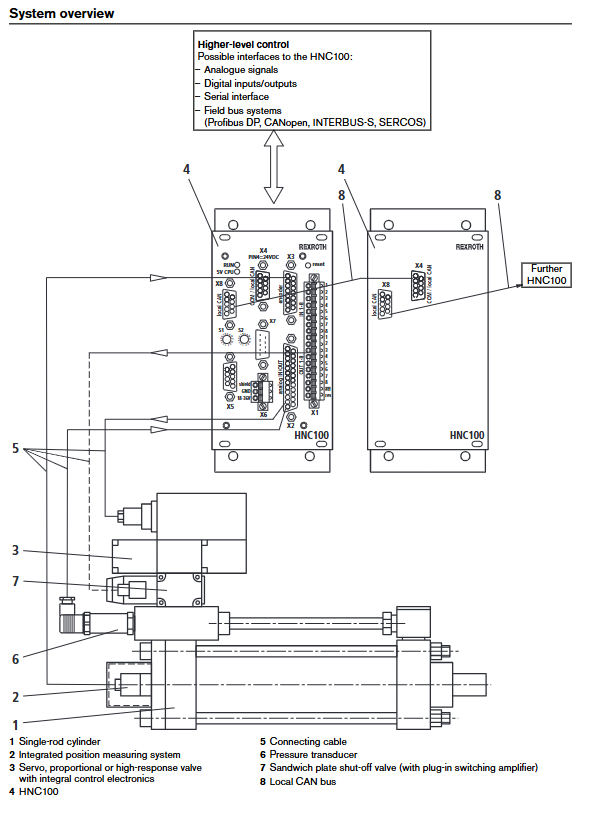 Fieldbus (X5, X7, X4): The standard configuration is RS232 serial port. If integration into higher-level control networks is required, Profibus DP (up to 12 MBaud), CANopen, or INTERBUS-S can be selected. The X4 port also provides a local CAN bus for parameterization or data exchange between multiple HNC100 controllers.