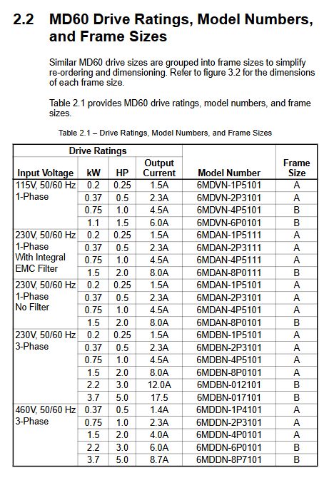 6MDAN-1P5: 230V single-phase input, 0.2kW, including EMC filter.