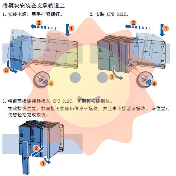 Subsequently, install the power module and CPU 312C in sequence. The module is mounted on the guide rail through a U-shaped hook on the back, and then fixed with screws. The front panel connector should be inserted into the "pre wired" position before wiring is completed to facilitate wire connection.