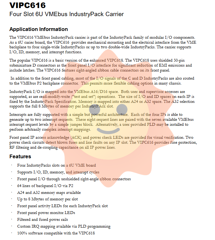 Industry Pack (IP) is a modular I/O standard widely used in industrial control, data acquisition, communication, and military embedded computing. The IP module is compact and interchangeable, and can be connected to various system buses (such as VME, PCI, CompactPCI, etc.) through a carrier board. VIPC616 is precisely such a 6U VME carrier board, which converts the signal of the VME backplane into the timing and power required by the Industry Pack, while providing mechanical fixation.