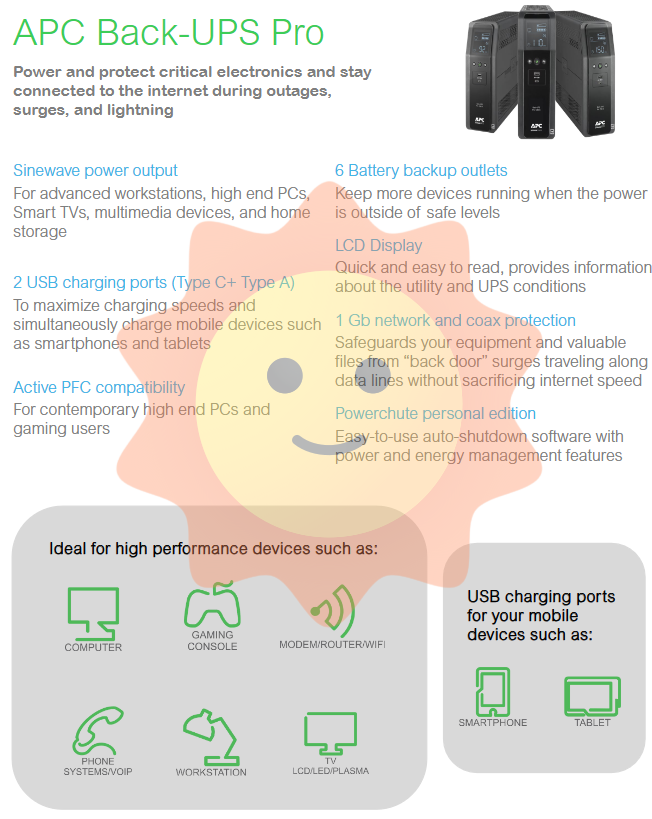With smartphones and tablets becoming an indispensable part of life, power sockets are no longer just serving PCs. Back UPS Pro innovatively integrates two USB charging ports: Type-C and Type-A.