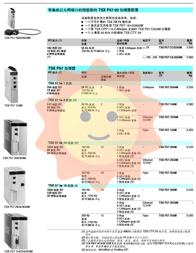 Fieldbus Master Station: Some processors have built-in Fipio (TSX P57 154/254/354/454/554M) or CANopen (TSX P57 0244M/1634M) bus managers.