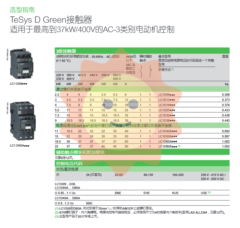 The TeSys D Green series covers rated operating currents (Ie, AC-3400V) from 9A to 80A, corresponding to motor powers ranging from 0.06kW to 37kW. The product is divided into two main connection types: