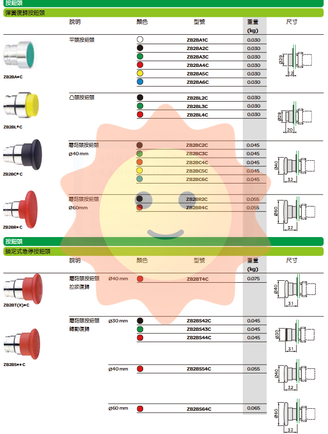 Mushroom head button (ZB2BC series): With a larger head diameter (Ø 40mm or Ø 60mm), it is easier to identify and press, and is usually used for important start stop control.