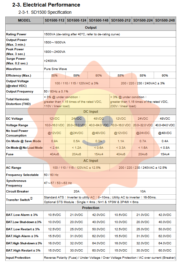 The electrical performance of each model in the SD series has been carefully designed to adapt to different load requirements and environmental conditions. Taking the SD2500 model as an example, describe its key parameters in detail: