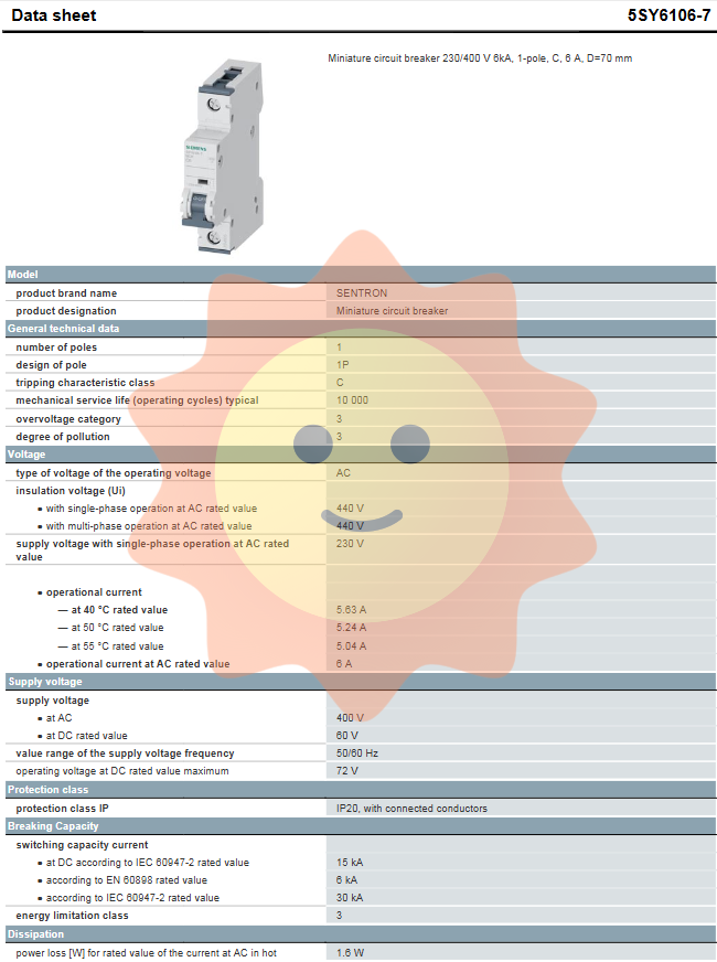 As a miniature circuit breaker with single pole (1P) C-type tripping characteristics, 5SY6106-7 provides a breaking capacity of up to 30kA (IEC 60947-2) under rated current conditions of 6A. Its excellent current limiting performance (energy limit level 3) can effectively suppress the impact of fault current on the system and ensure the safety of electrical equipment and personnel.
