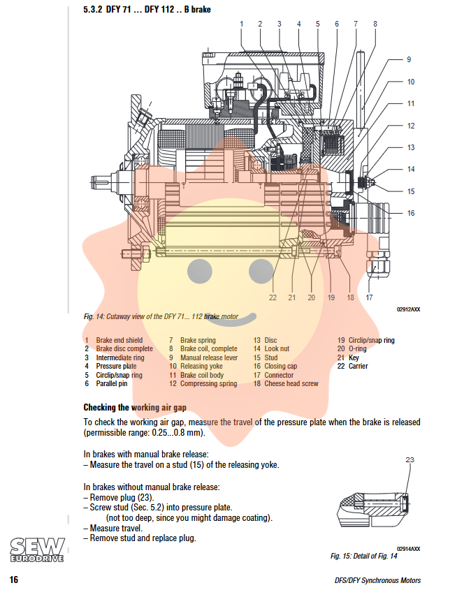 Brake with manual release: Remove the manual release lever. Without manual release: Remove the screw plug (23) from the hole.
