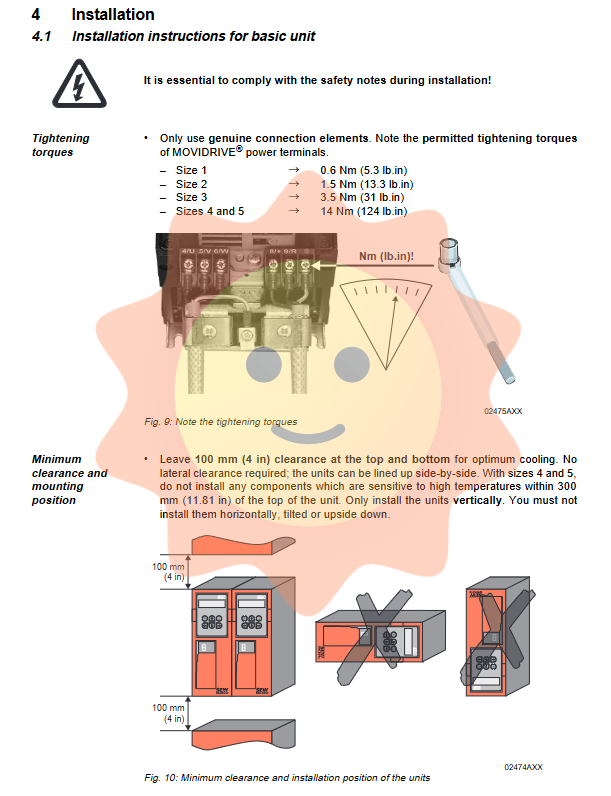 The equipment is named clearly and the nameplate information is complete, making it easy to identify and trace. During installation, it is necessary to strictly follow the requirements of vertical installation and reserved heat dissipation spacing (at least 100mm at the top and bottom), and pay attention to the tightening torque of different sizes (such as 0.6 Nm for size 1 and 14 Nm for sizes 4-5).