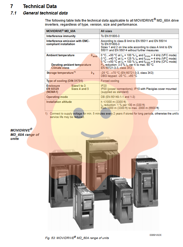 MOVIDRIVE ® The MD-60A series covers power ranges from 1.5 kW to 90 kW (230V model) and 2.2 kW to 90 kW (400/500V model). Its general technical data includes: