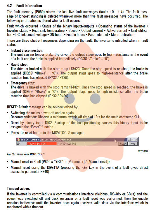 28. If there is no master-slave communication during the fast parking monitoring time of the fieldbus timeout, check the communication of the master station, extend P819 or turn off the monitoring