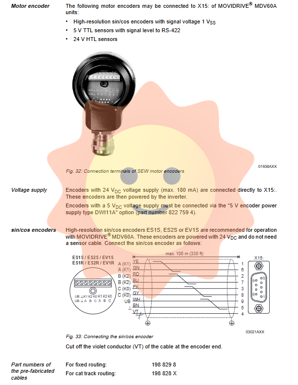 High resolution Sin/Cos encoder: ES1S, ES2S, or EV1S are recommended. This type of encoder is powered by 24V DC and does not require a separate sensing cable. Attention should be paid when wiring: Cut the purple wire (VT) at the motor end.