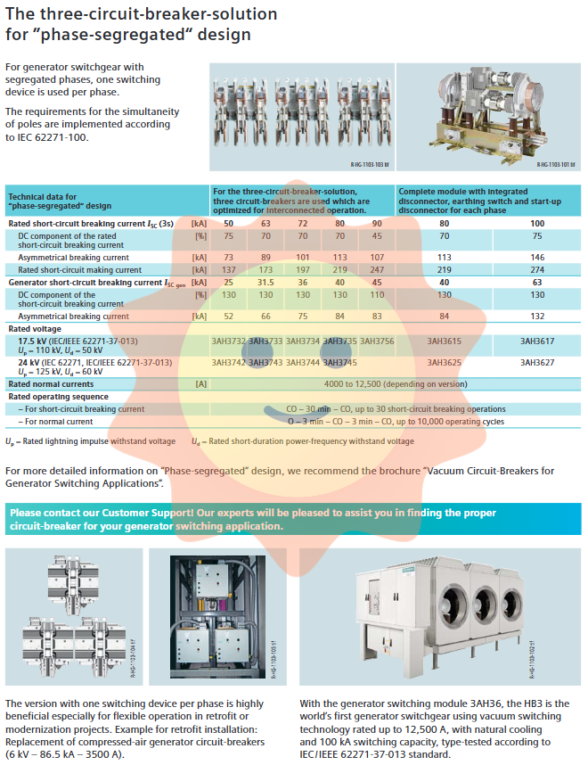 3AH37/3AH38 (generator type) IEC 62271-100 and IEC/IEEE 62271-37-013 17.5 kV, 24 kV 3150 A-12000 A (forced air cooling) up to 90 kA thermal/hydraulic/nuclear power generator outlet protection