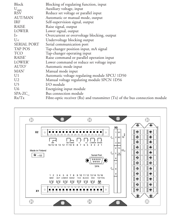 Module composition: It consists of an automatic voltage regulation module (SPCU 1D50), a manual voltage regulation module (SPCN 1D56), a power module (SPGU 240 A1/SPGU 48 B2), an I/O module (SPTR 6B32), and a motherboard. It supports fiber optic serial bus communication (requires SPA-ZC series bus modules).