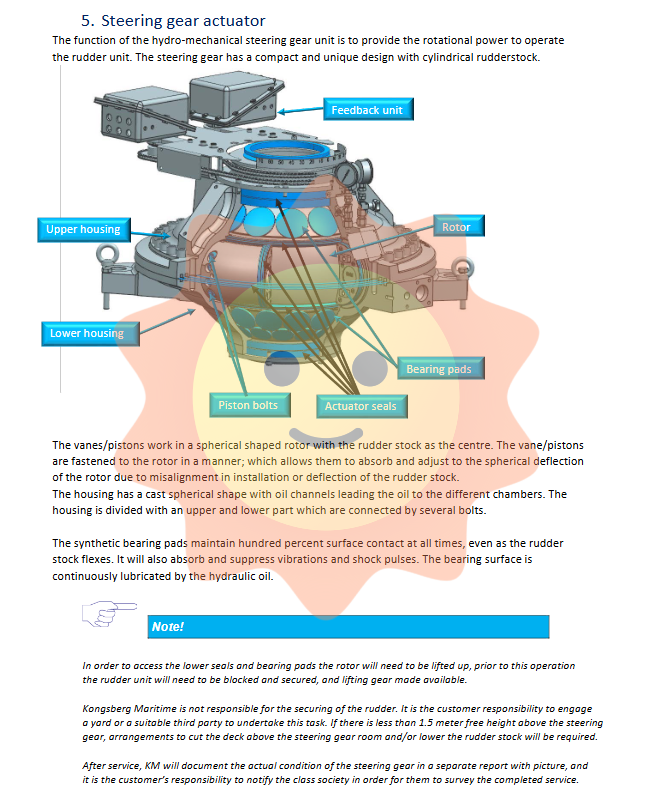 Important notice: To access the lower seal and bearing gasket, it is necessary to lift the rotor. Prior to this, it is necessary to securely lock the rudder blades and prepare the lifting equipment. Kongsberg is not responsible for fixing the rudder blades, which is entrusted to the shipyard or a suitable third party by the shipowner.