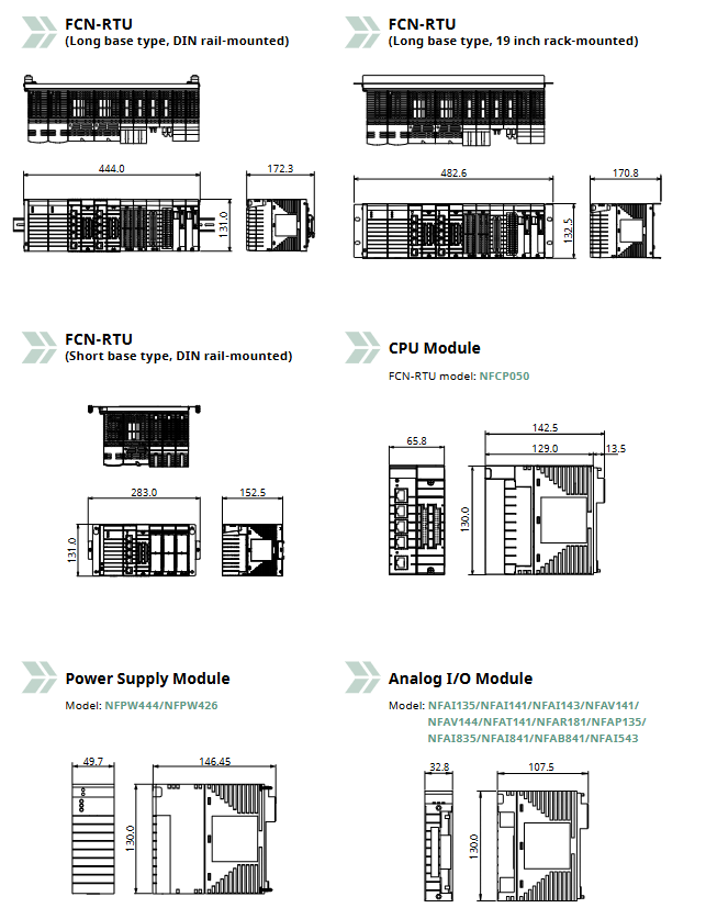 Base Module: Provides physical connections and backplane bus. There are long (NFBU200, supporting power redundancy) and short (NFBU050) options available, supporting 19 inch rack mounting and DIN rail mounting respectively.