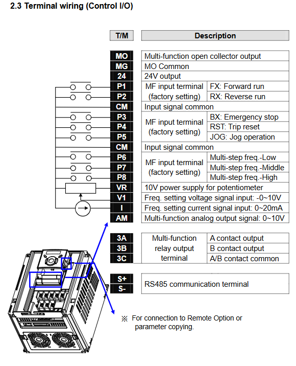 Common error: Setting drv=1 (terminal control) but not short circuiting Fx-CM, motor does not turn; Or Frq=0 but no frequency input on the keyboard.