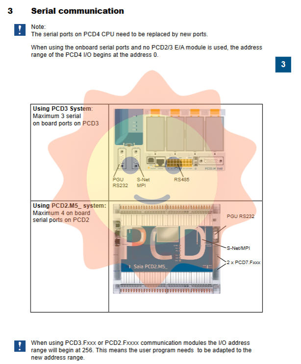 The serial port on the original PCD4 CPU needs to be replaced by a new communication port after the upgrade. If only the onboard serial port is used and no PCD2/3 I/O modules are added, the PCD4 I/O address range remains at 0. Once the PCD3. Fxxx or PCD2. Fxxxx communication module is used, the I/O address range will change from 256 onwards, and the user program must adjust all address references related to serial communication accordingly.