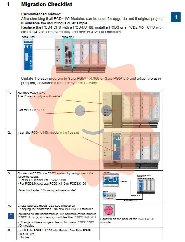 Confirm compatibility: Check if all existing PCD4 I/O modules are supported by the new platform (most standard modules are supported, except for H-series counting modules).