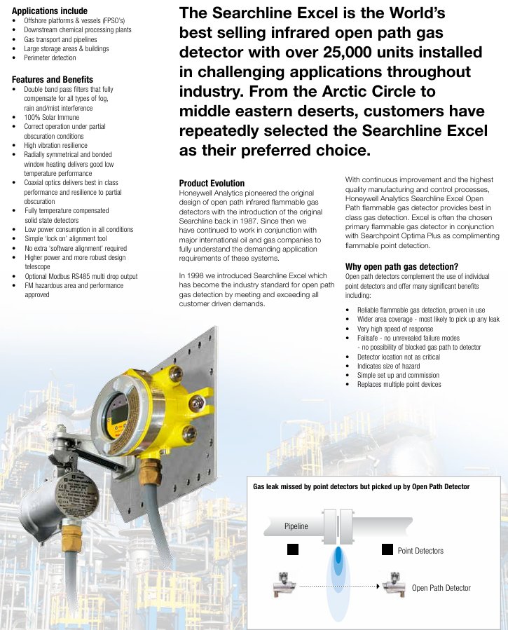 Industry benchmark: In 1987, Honeywell first launched the first generation Searchline open circuit infrared combustible gas detector. After upgrading to Searchline Excel in 1998, it became the industry standard in the field of open circuit gas detection with performance that meets and exceeds customer needs. It is often paired with Searchpoint Optima Plus point detectors as the main combustible gas detection solution.