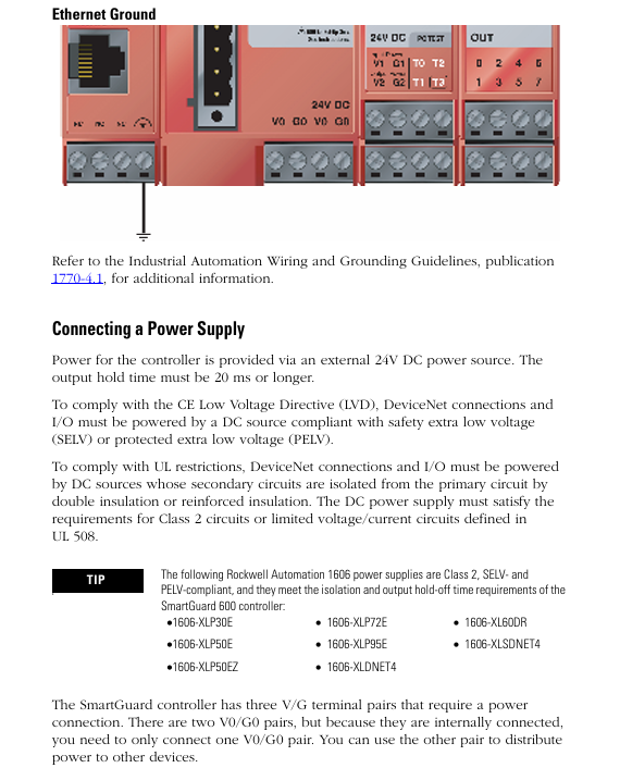 Safety compliance: Must meet SELV/PELV (CE LVD), Class 2 (UL 508), and recommend Rockwell 1606 series power supplies (such as 1606-XLP30E, 1606-XL60DR);