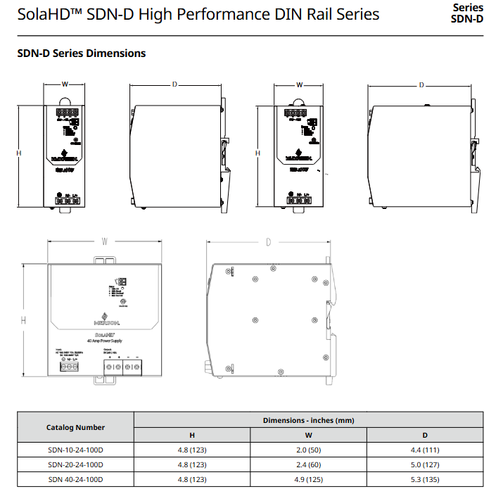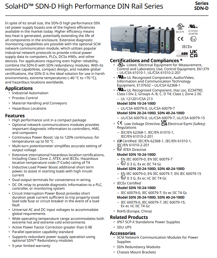 In industrial automation control systems, the rail power supply is a key link in providing stable DC power to core components such as PLCs, I/O modules, sensors, and communication equipment. A high-performance and highly reliable power supply not only determines the operational stability of the control cabinet, but also directly affects the continuous operation of the entire production line. The SDN-D series DIN rail power supply launched by SolaHD has become an ideal choice for harsh industrial environments and hazardous locations due to its high efficiency, compact size, wide operating temperature range, and powerful diagnostic monitoring capabilities. This article will systematically analyze the SDN-D series power supply from multiple dimensions, including technical characteristics, selection specifications, installation points, communication monitoring, and on-site troubleshooting, providing a practical technical guide for on-site engineers.