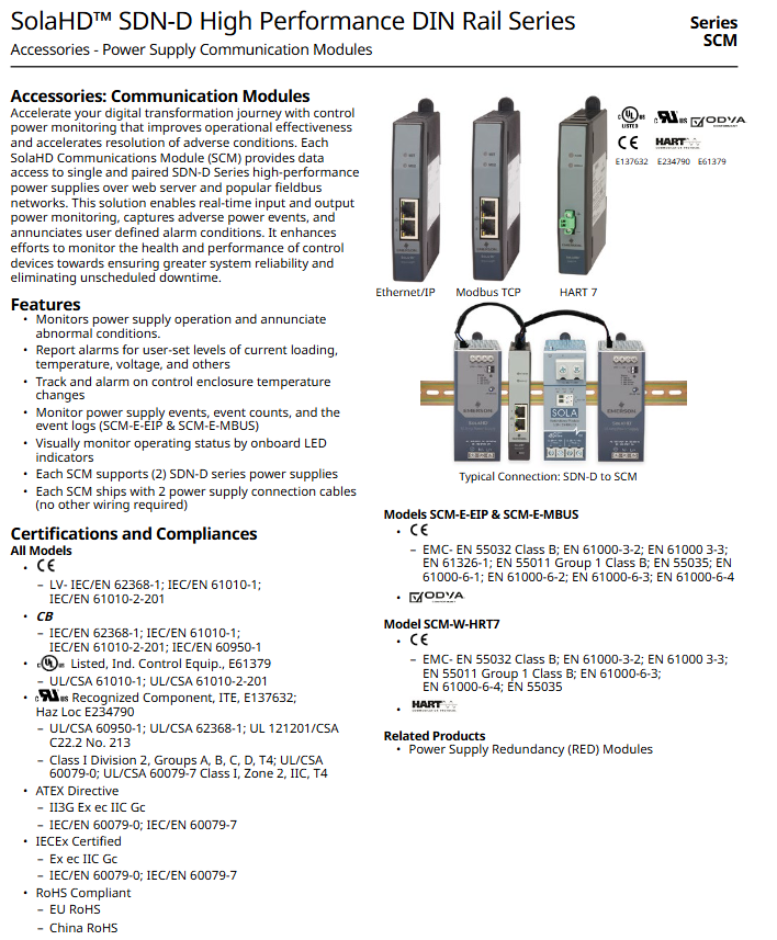 To achieve Industry 4.0 level power health management, SolaHD provides the SCM (SolaHD Communications Module) series of communication modules. Each SCM module can be connected to 1 or 2 SDN-D series power supplies, which can be directly plugged in through the included 8-inch connection cable without additional wiring.
