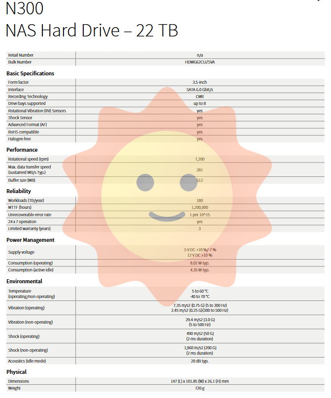 Power management: The N300 series performs well in power control. Taking the 22TB model as an example, the typical operating power consumption is only 8.02W, and the standby power consumption is as low as 4.35W. The lower operating temperature helps to extend the lifespan of the hard drive and reduce the overall heat dissipation requirements of the NAS system.