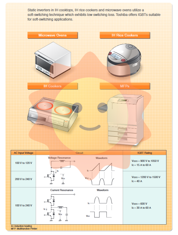 In situations where voltage or current resonant soft switching technology is used in IH cookware, microwave ovens, etc., switching losses are significantly reduced. Toshiba offers an IGBT series optimized for soft switching.
