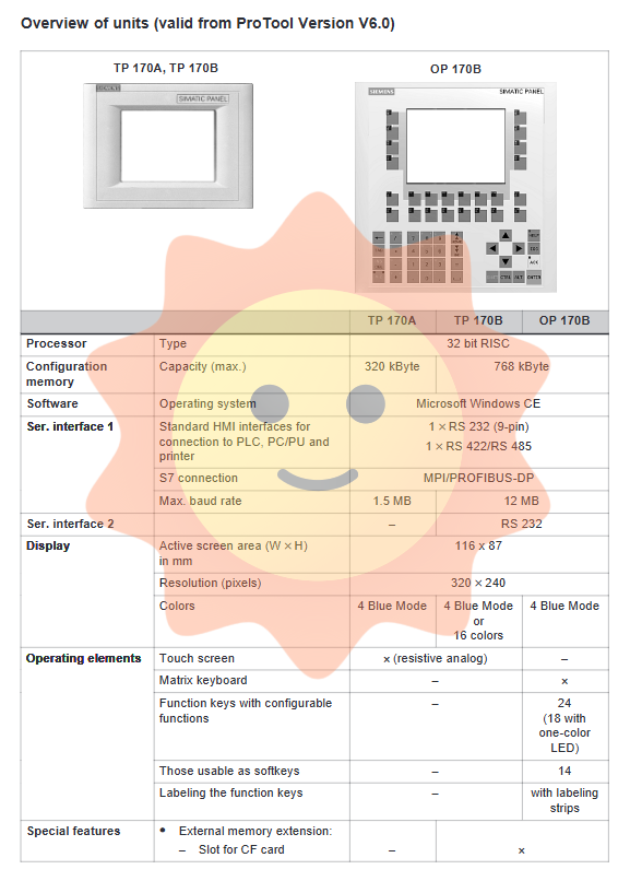 The device is equipped with a 32-bit RISC processor and runs Windows CE system. The TP 170A has a configured memory of 320 KB, while the TP 170B and OP 170B have 768 KB. They support storage expansion through CompactFlash (CF) cards for recipe data, project backup, and more.