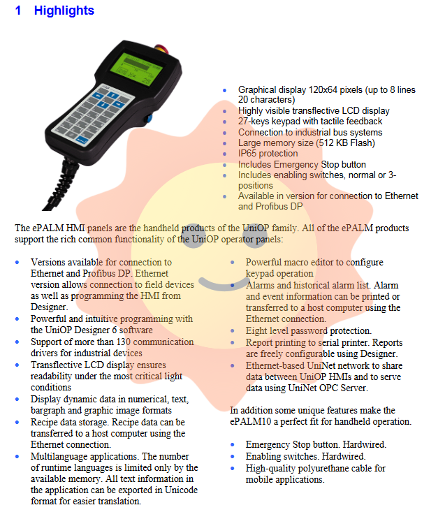 In modern industrial automation, fixed operation panels have been widely used in various types of equipment, but many scenarios require operators to monitor and intervene near the equipment or during the movement of the production line. Exor's ePALM10 handheld HMI was born for this purpose. It combines the powerful features of the UniOP family with the portability of handheld devices, equipped with a graphic display screen, multifunctional keyboard, emergency stop button, enable switch, and multiple communication options, making it an ideal mobile terminal for factory workshops, large machinery, assembly lines, and other occasions. This article is based on the official product manual and provides a comprehensive analysis of the technical features, operating instructions, connection methods, and attachments of ePALM10.