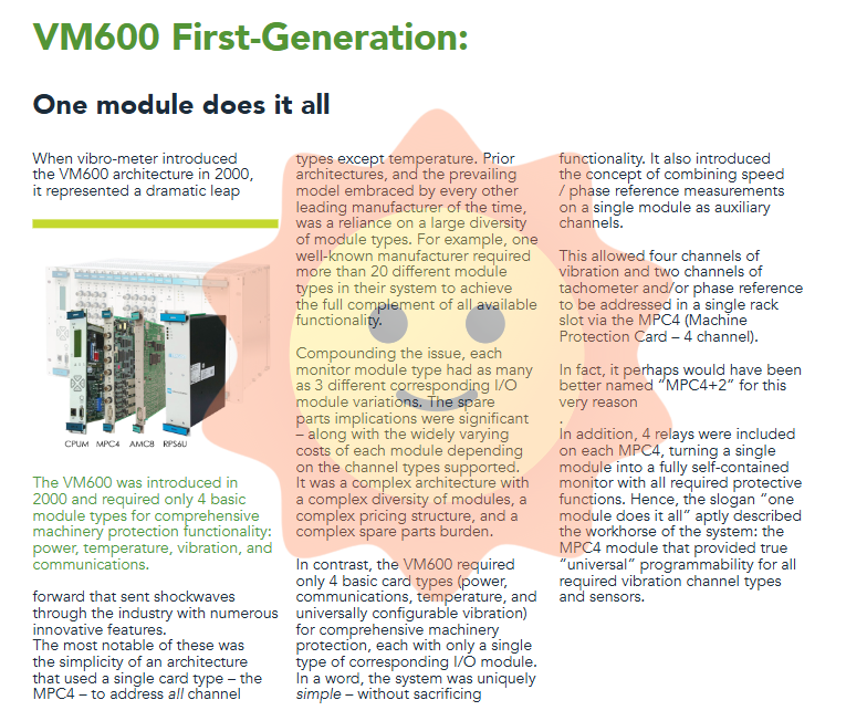 The module is highly versatile: a complete mechanical protection system can be built with only four basic cards: power supply, temperature, vibration (MPC4), and communication, while the mainstream solution at that time required more than 20 modules.