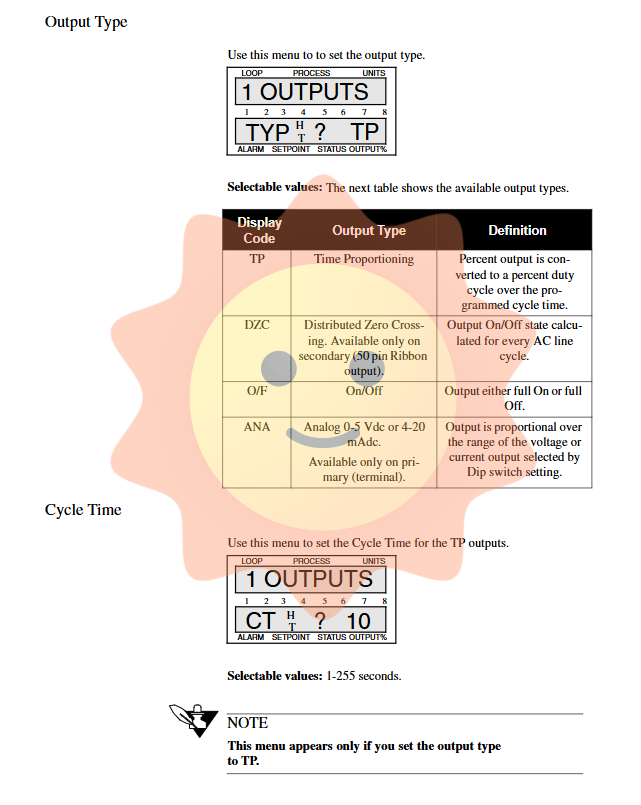 TP (Time Proportional): The output simulates an analog quantity by changing the on-off time ratio within one cycle, commonly used to drive SSRs.