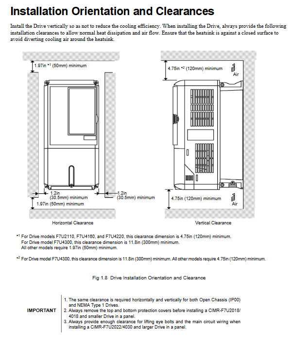 F7 drivers are divided into two types: NEMA Type 1 (IP20) enclosed and Open Chassis (IP00) open. During installation, it is necessary to follow: