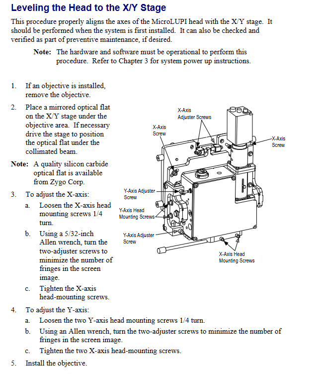 Calibrate the machine head and X/Y stage: After removing the objective lens, place the optical flat mirror and adjust the X/Y axis adjustment screws to minimize the number of interference fringes