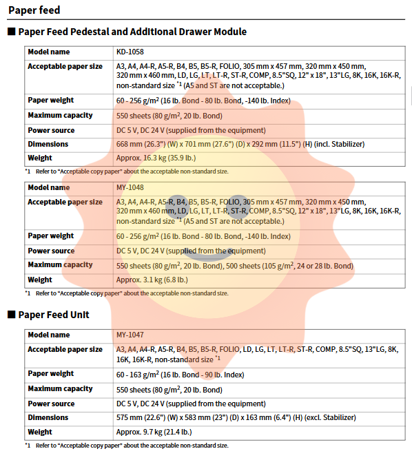 Paper box expansion: includes a paper box base (KD-1058), an additional drawer module (MY-1048), and a separate paper feeding unit (MY-1047), which can significantly increase the total paper feeding capacity.